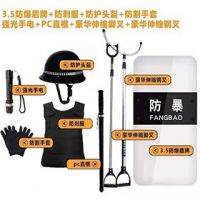 防暴器材8件套名稱:防暴盾牌、防刺服、防割手套、抓捕叉、警棍、強光手電、防暴頭盔、裝備架。