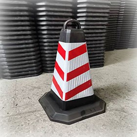 豪潞牌路錐采用PVC材料注塑而成,集塑料的韌性于一身,配高反光材料,反光效果好。錐體表面應用反光材料有反光貼膜PVC反光錐套。